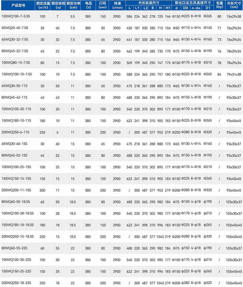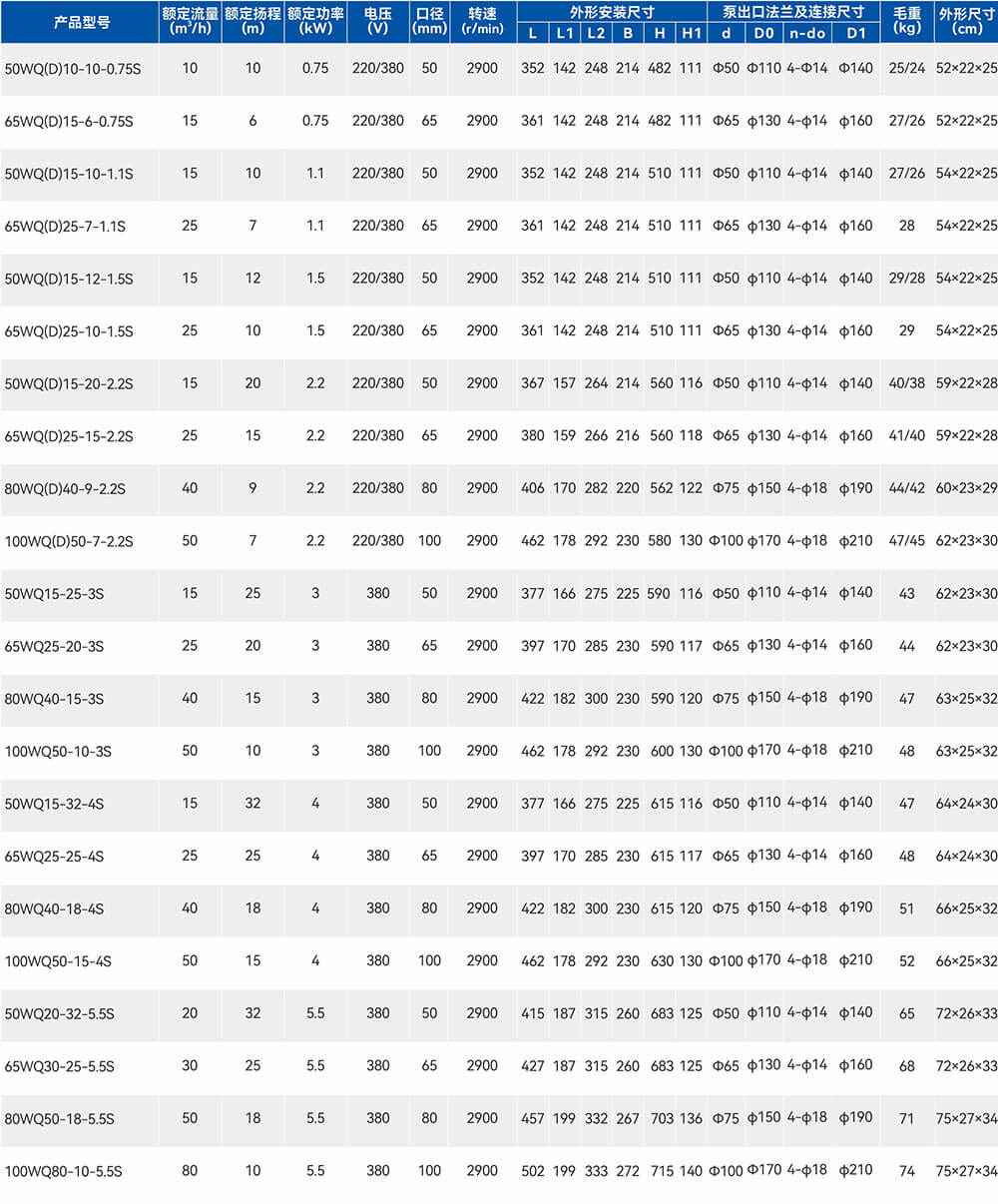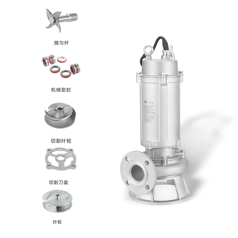國標法蘭WQ(D)-S全不銹鋼精密鑄造污水污物潛水電泵采用不銹鋼精密鑄造外殼,具有耐腐蝕、環(huán)保型、揚程高、流量大等特點。